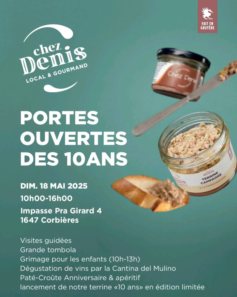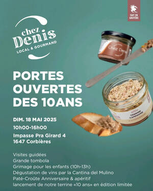 Dimanche dernier, Chez Denis, notre producteur de terrines locales et gourmandes, fêtait ses 10 ans. C'était pour nous l'occasion rêvée de lui rendre visite et de découvrir sa fabrique artisanale à Corbières, au bord du lac de Gruyère.