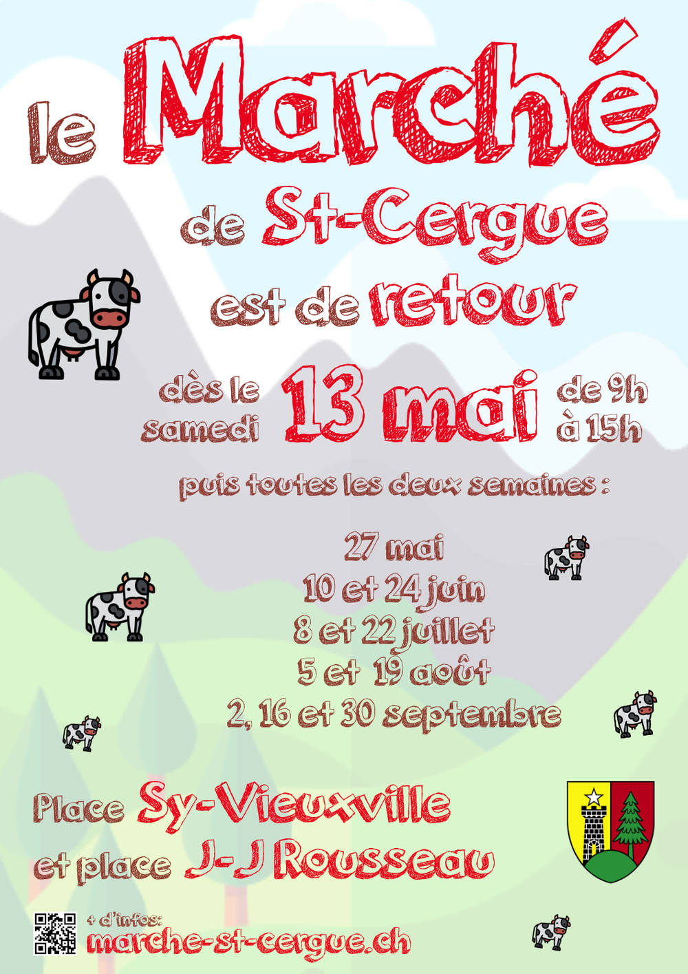 Dès samedi 13 mai, retrouvez-nous également au marché de St-Cergue. Nous vous proposerons une offre de fruits et légumes BIO, locaux et de saison ainsi que quelques autres articles (farines, miels, boissons, etc...).